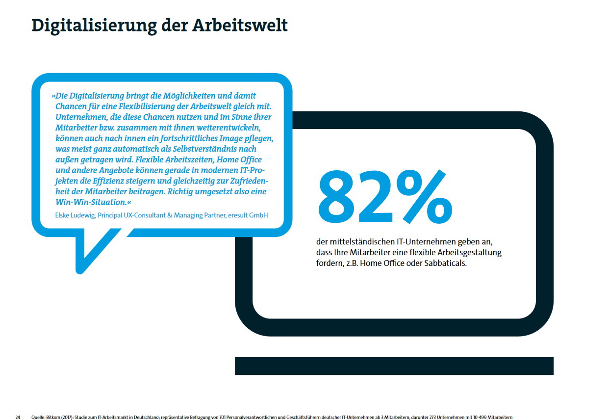 Auch die Arbeitswelt müsse laut Bitkom weiter mit Hochdruck modernisiert werden. Hier nennt der Branchenverband beispielsweise die Umstellung von der täglichen auf eine wöchentliche Höchstarbeitszeit. Zudem sei es gerade für die Wettbewerbsfähigkeit von in ländlichen Gebieten ansässigen IT-Mittelständlern wichtig, dass die Politik schnellstens die passenden Rahmenbedingungen für den Breitbandausbau schaffe.