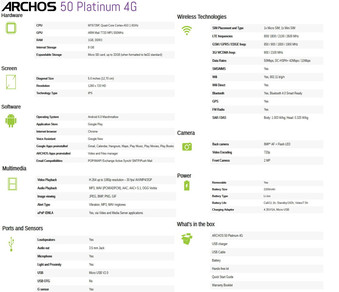 Das 145 x 72 x 9,4 Millimeter messende und 152 Gramm leichte Archos 50 Platinum 4G Smartphone arbeitet mit einem MediaTek MT6735P Vierkernprozessor @1,0 GHz inklusive 1 GB RAM und 8 GB internem Speicher. Der Systemspeicher des Dual-SIM-Smartphones kann mittels microSD-Speicherkarten um bis zu 32 GB erweitert werden.