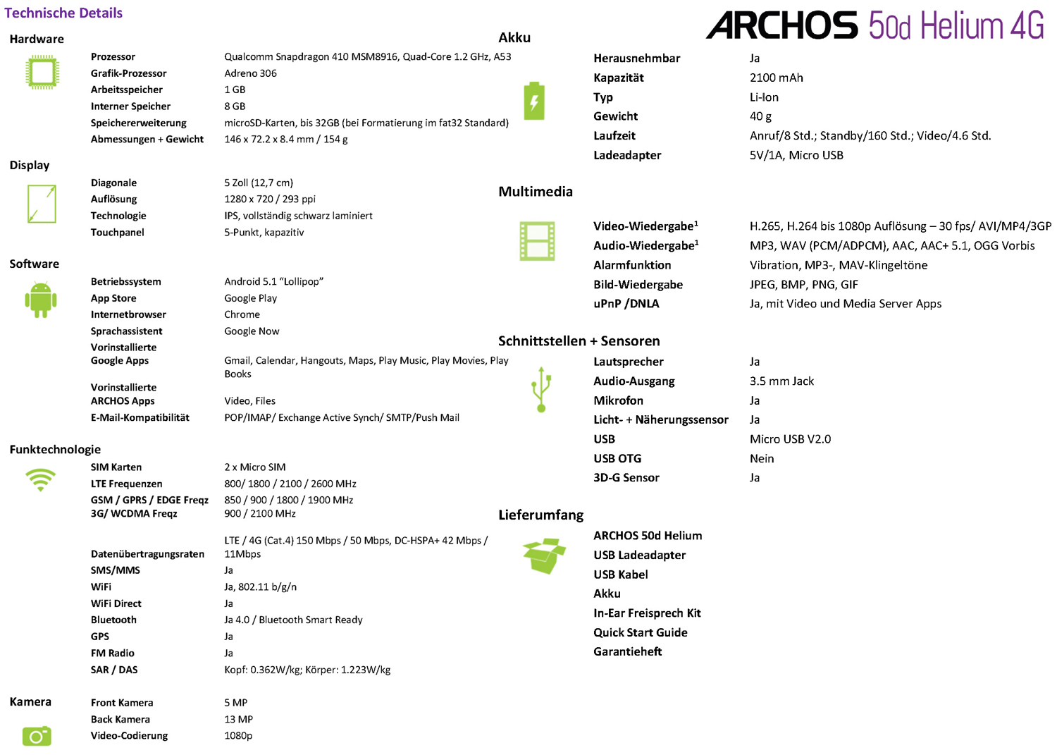 Zum Lieferumfang des Archos 50d Helium gehören 2 Wechselcover in den Farben Blau und Grau. Für Videoaufnahmen und zum Fotografieren bietet das Archos 50d Helium an der Rückseite eine 13-MP-Hauptkamera. Vorne empfiehlt sich eine 5-MP-Frontkamera für Selfies oder Videochats. Als Prozessor arbeitet im 50d Helium ein Qualcomm Snapdragon 410 MSM8916 4-Kern-Prozessor inklusive Adreno 306 GPU, der von 1 GByte Arbeitsspeicher (RAM) und 8 GB internem Speicher unterstützt wird. Via microSD-Karten kann der Systemspeicher um bis zu 32 GB erweitert werden.