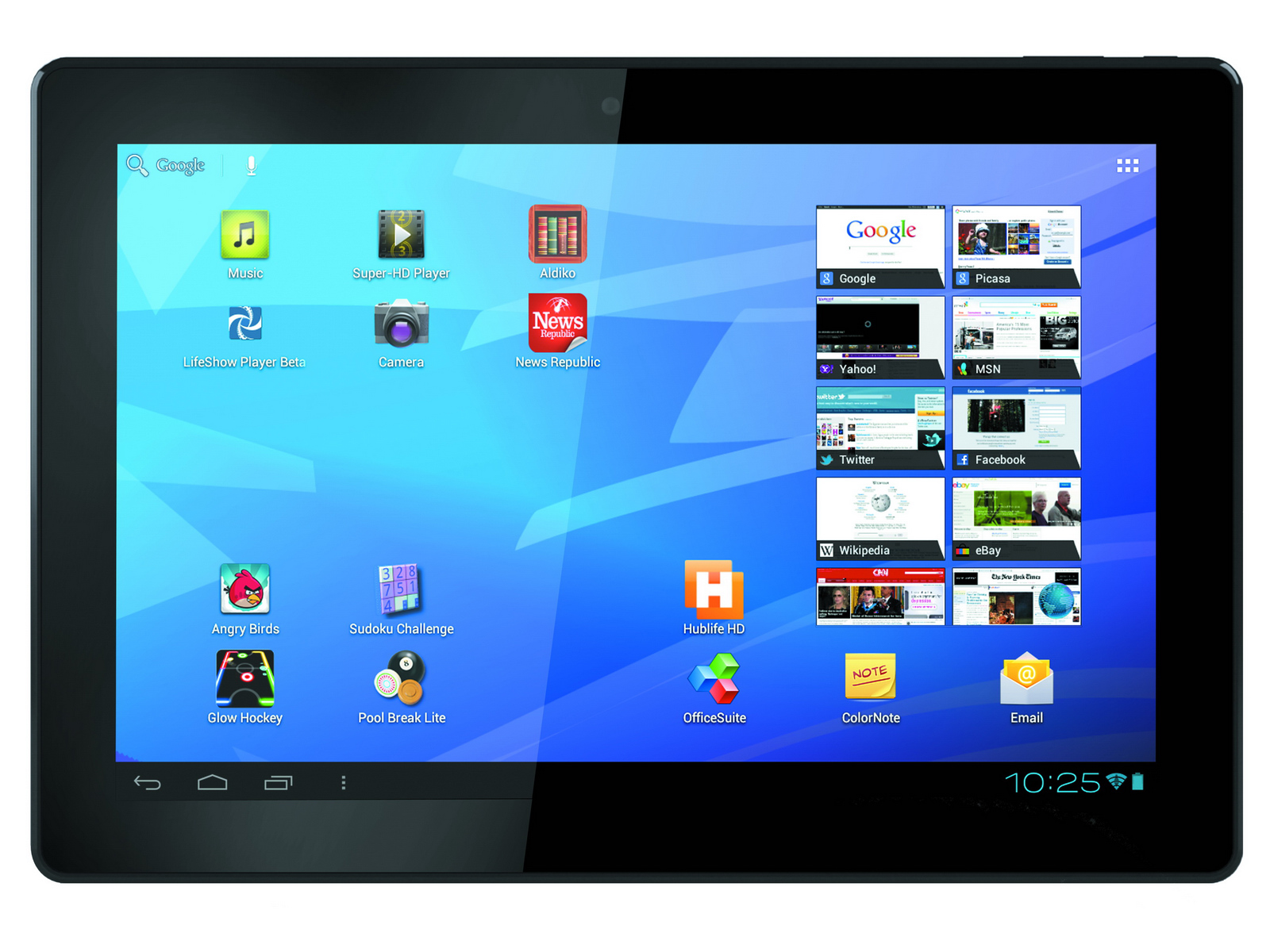 Ansonsten verfügt das Arnova FamilyPad 13.3 über eine WLAN-Schnittstelle sowie je eine front- und eine rückseitige 2,0-MP-Kamera. Als Prozessor rechnet ein ARM Cortex-A8 basierter Allwinner A10 Single-Core mit 1 GHz. 1 GByte RAM, 8 GByte Flashspeicher, der sich via micro-SDHC-Slot auf bis zu 32 GByte erweitern lässt, ein integriertes Mikrofon, Stereolautsprecher, ein micro-USB-Host-2.0 für den Anschluss externer Geräte und ein mini-HDMI-Port runden die Ausstattung des 262 x 171 x 12,5 Millimeter messenden und rund 1,3 Kilogramm schweren FamilyPad ab.