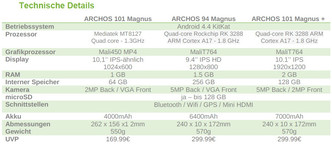 Während das knapp 300 Euro teure Modell 94 Magnus (9,4 Zoll) eine HD-Auflösung von 1280 x 800 Pixeln bietet, zeigt das 101 Magnus mit 10,1"-Panel nur 1024 x 600 Bildpunkte. Dafür ist das 101er mit rund 170 Euro das günstigste Tablet des Trios. Wer eine feinere Auflösung sucht, muss gleich zum 101 Magnus Plus mit Full-HD-Display und 1920 x 1200 Pixeln greifen, für das ebenfalls rund 300 Euro fällig werden.