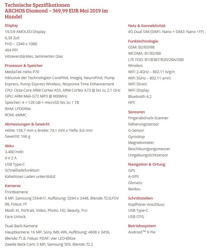Im Vergleich zum Vivo V15 Pro steht dem Nutzer mit dem Archos Diamond zudem ein schwächerer 3.400-mAh-Akku und lediglich Bluetooth 4.2 zur Verfügung. Das V15 Pro setzt hier eine Batteriekapazität von 3.700 mAh mit Dual-Engine Fast Charging und Bluetooth 5.0 entgegen. Geladen wird in beiden Fällen über USB Typ-C oder Wireless. Einen In-Display-Fingerabdrucksensor haben die beiden Phones ebenfalls. Als Mobile-OS läuft auf dem Archos Diamond Googles Android 9 Pie.
