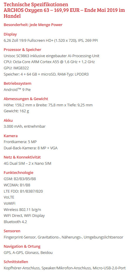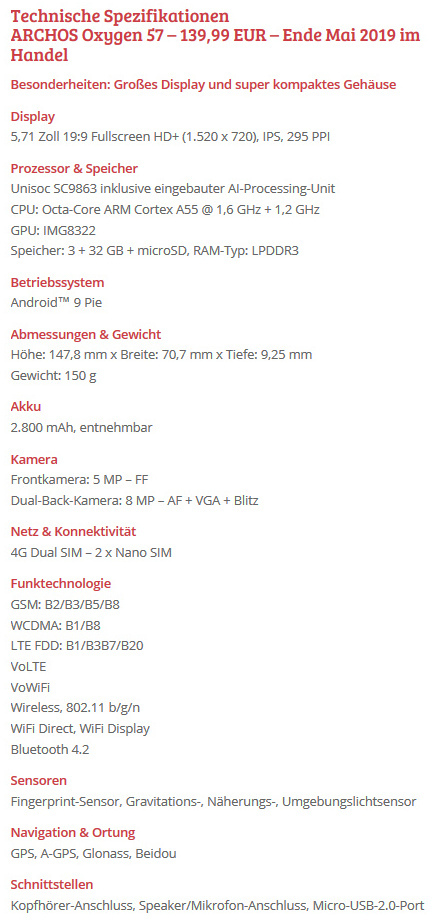 Die Archos Oxygen 57, 63 und 68XL Smartphones unterstützten zudem LTE Cat. 7, VoLTE und VoWiFi. Zur Ausstattung der neuen Oxygen-Smartphones gehört außerdem eine 8-MP-Dualkamera an der Rückseite sowie eine 5-MP-Selfiecam vorne. Als OS nutzen Archos Oxygen 57, 63 und 68XL bereits Android 9 Pie. Den schwächsten Akku hat das Oxygen 57 mit 2.800 mAh, das 68XL nutzt eine 5.000-mAh-Batterie. Ende Mai 2019 kommen Oxygen 57 für 140 Euro, Oxygen 63 für 170 Euro und das Oxygen 68XL für 200 Euro (alles UVPs) auf den Markt.