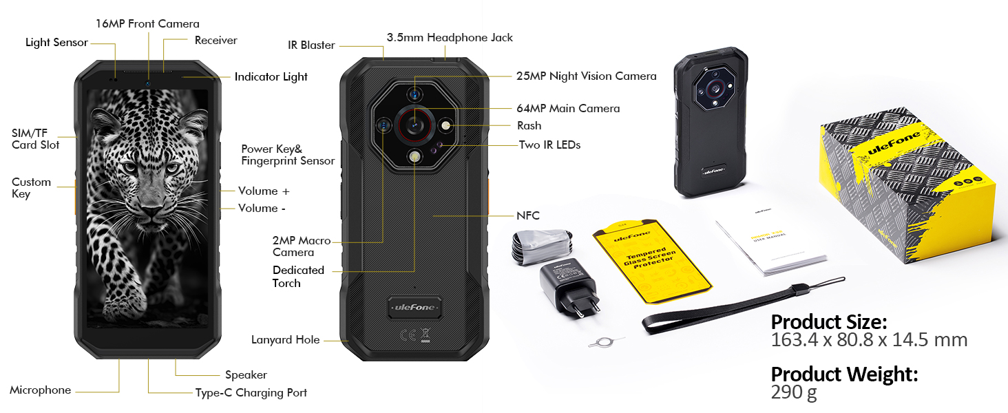 Das Smartphone misst 163,4 x 80,8 Millimeter und ist 14,5 Millimeter dick und 280 Gramm schwer. Das Smartphone soll mit den Anforderungen von IP68, IP69K und MIL-STD-810H übereinstimmen und dementsprechend recht gut geschützt sein. Als SoC kommt der MediaTek Helio G91 zum Einsatz, wobei der SoC auf einen 6 Gigabyte großen Arbeitsspeicher zurückgreifen kann. Der interne Speicher ist 128 Gigabyte groß und kann mithilfe einer Speicherkarte erweitert werden.