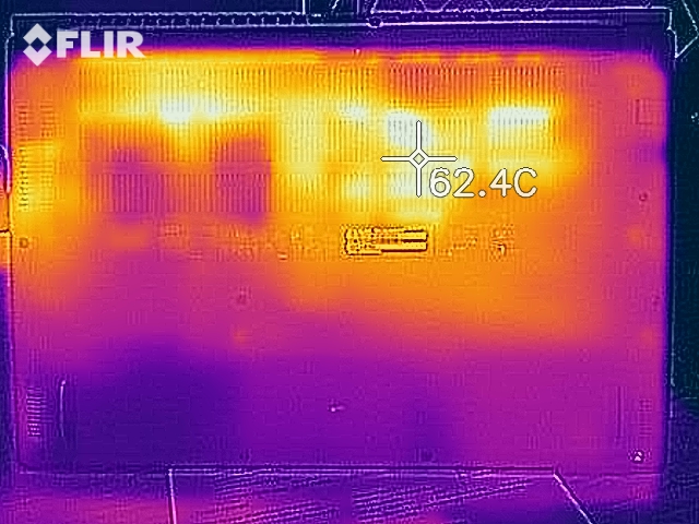 (-) Auf der Unterseite messen wir eine maximalen Wert von 58.7 °C (im Vergleich zum Durchschnitt von 39.2 °C).