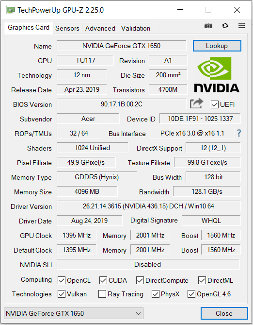 Der GeForce-GTX-1650-Grafikkern (Turing-Architektur) stellt Nvidias aktuelles Mittelklasse-Modell für Notebooks dar. Er unterstützt DirectX 12 und arbeitet mit einer Basisgeschwindigkeit von 1.395 MHz. Per Boost ist eine Steigerung auf bis zu 1.560 MHz möglich.
