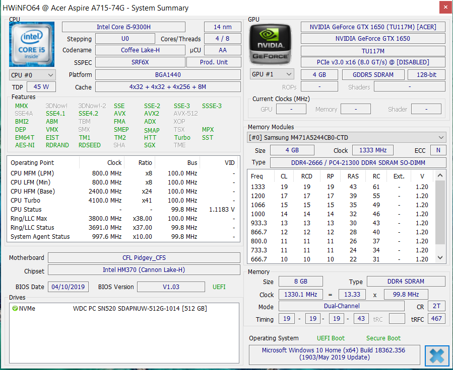 Das Aspire wird von einem Core-i5-9300H-Vierkernprozessor (Coffee Lake) angetrieben. Die CPU arbeitet mit einer Basisgeschwindigkeit von 2,4 GHz. Per Turbo kann der Takt auf 4 GHz (vier Kerne) bzw. 4,1 GHz (ein Kern) gesteigert werden.
