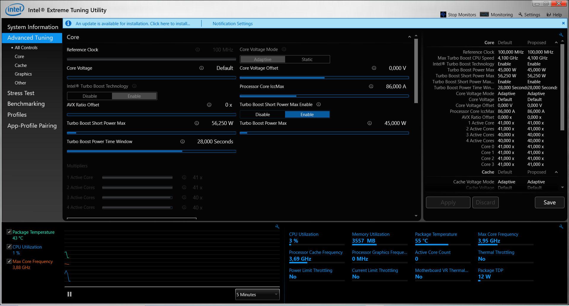 Die Multi-Thread-Tests der Cinebench-Benchmarks bearbeitet der Prozessor kurzzeitig mit 3,4 bis 4 GHz, dann sinkt der Takt auf 3,3 bis 3,4 GHz. Die Single-Thread-Tests werden mit 4 bis 4,1 GHz durchlaufen. Im Akkubetrieb geht die CPU mit 2,7 bis 3,1 GHz (Multi-Thread) bzw. 2,5 bis 4,1 GHz (Single-Thread) zu Werke.