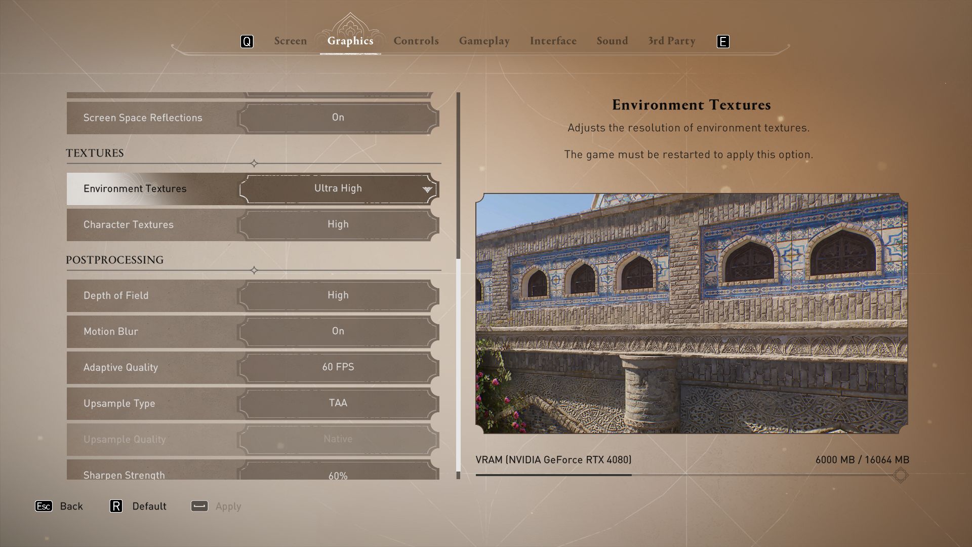 Wenig zu meckern gibt es beim Optionsmenü. Zwar halten wir es für etwas ungünstig, dass bei den fünf vorhandenen Presets immer automatisch Adaptive Quality aktiviert ist (wurde für die Tests jeweils ausgeschaltet), ansonsten verdient Ubisoft aber viel Lob. Neben der Menge an Optionen gebührt auch den Texterläuterungen und Vergleichsbildern Respekt – noch besser geht es kaum. Dazu kommt eine praktische VRAM-Anzeige. Laut derer benötigt Mirage in FHD/Ultra um die 6 GB und in 4K/Ultra rund 7 GB – nicht unbedingt kleine, aber auch keine übertriebenen Werte. Wie es sich für ein modernes Spiel gehört, sind optional auch die Upscaling-Technologien XeSS, FSR und DLSS nutzbar.
