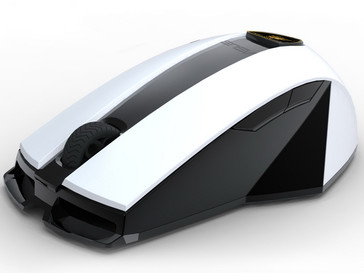 Knüller: Die optional erhältliche kabellose WX-Automobili Lamborghini-Maus ziert ein wuchtiger und tiefer Frontspoiler, das Scrollrad (Mausrad) kommt als dicke Gummiwalze mit rennsporttauglichem Profil daher. Die WX-Lambo-Maus arbeitet mit 2.500 dpi, die Reichweite beträt mit USB-Nano-Stecker rund zehn Meter.