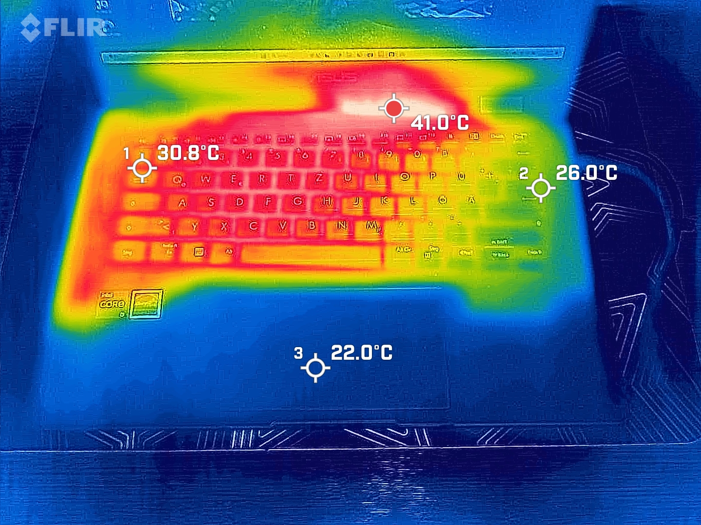 Die Temperaturen des Asus BR1402FG sind durchweg sehr gut. Im Idle messen wir in der Spitze nur 24 °C an der Oberseite und 22 °C an der Unterseite. Auch unter Last halten sich die Temperaturen in Grenzen. Auf der Oberseite gibt es mittig über der Tastatur einen Hotspot von 41 °C. Im Durchschnitt liegt die Oberseite aber bei durchschnittlich 28,4 °C und auf der Unterseite konnten wir durchschnittlich 28 °C messen.