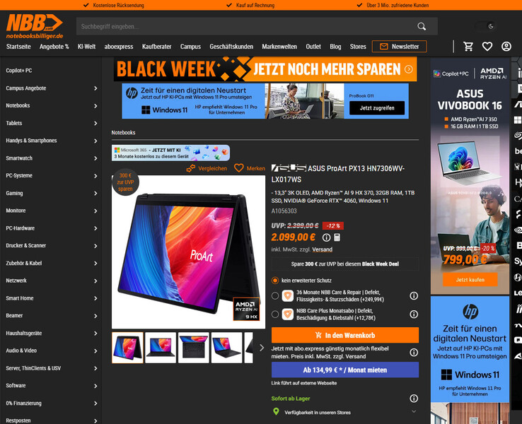 Asus führt mit der ProArt-PX13-Reihe eine Linie von leistungsstarken, kompakten Convertibles im Sortiment. Neben potenten AMD APUs haben die Geräte auch kräftige GPUs (GeForce RTX 4050, 4060 oder 4070) der Firma Nvidia an Bord. Aktuell führen Notebooksbilliger.de und Amazon einen gut ausgestatteten Vertreter der Reihe zu einem Angebotspreis von 2.099 Euro im Sortiment. Das leistungsstärkste Modell der Serie musste sich bereits einem Test stellen und ergatterte dabei die Wertung „Gut (86 %)“.