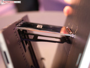 Die Mechanik geht nach etwas Übung sauber auf und schiebt sich in ihre Endposition. Das Gelenk besteht aus Metall und erscheint relativ stabil. Unsachgemäßes Zerren und Ziehen würde dem Mechanismus jedoch schnell den Garaus machen. Die Unterseite des Tablets ist griffig weil gummiert.