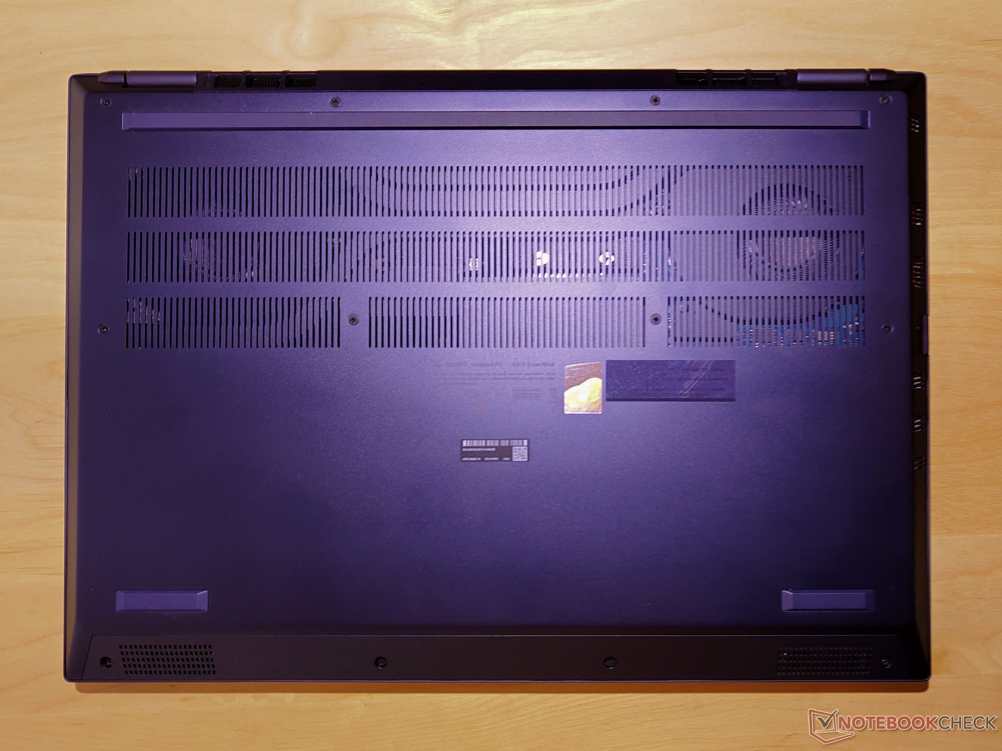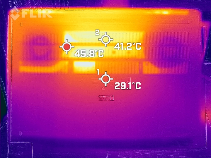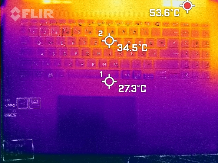 Das ExpertBook B6 Flip bläst seine Abwärme auch nach oben aus. Zwischen den Scharnieren befinden sich zwei Lüftungsöffnungen, die sehr warm werden können. Im Bereich der Tastatur und der Handauflageflächen bleibt die Workstation trotz leistungsstarke Hardware aber ausgesprochen kühl. Das Gleiche gilt auch für die Unterseite des Notebooks. Im Vergleich zur Raumtemperatur erwärmt sich kein Teil des Notebooks, mit dem man normalerweise Kontakt hat, um mehr als 10 °C