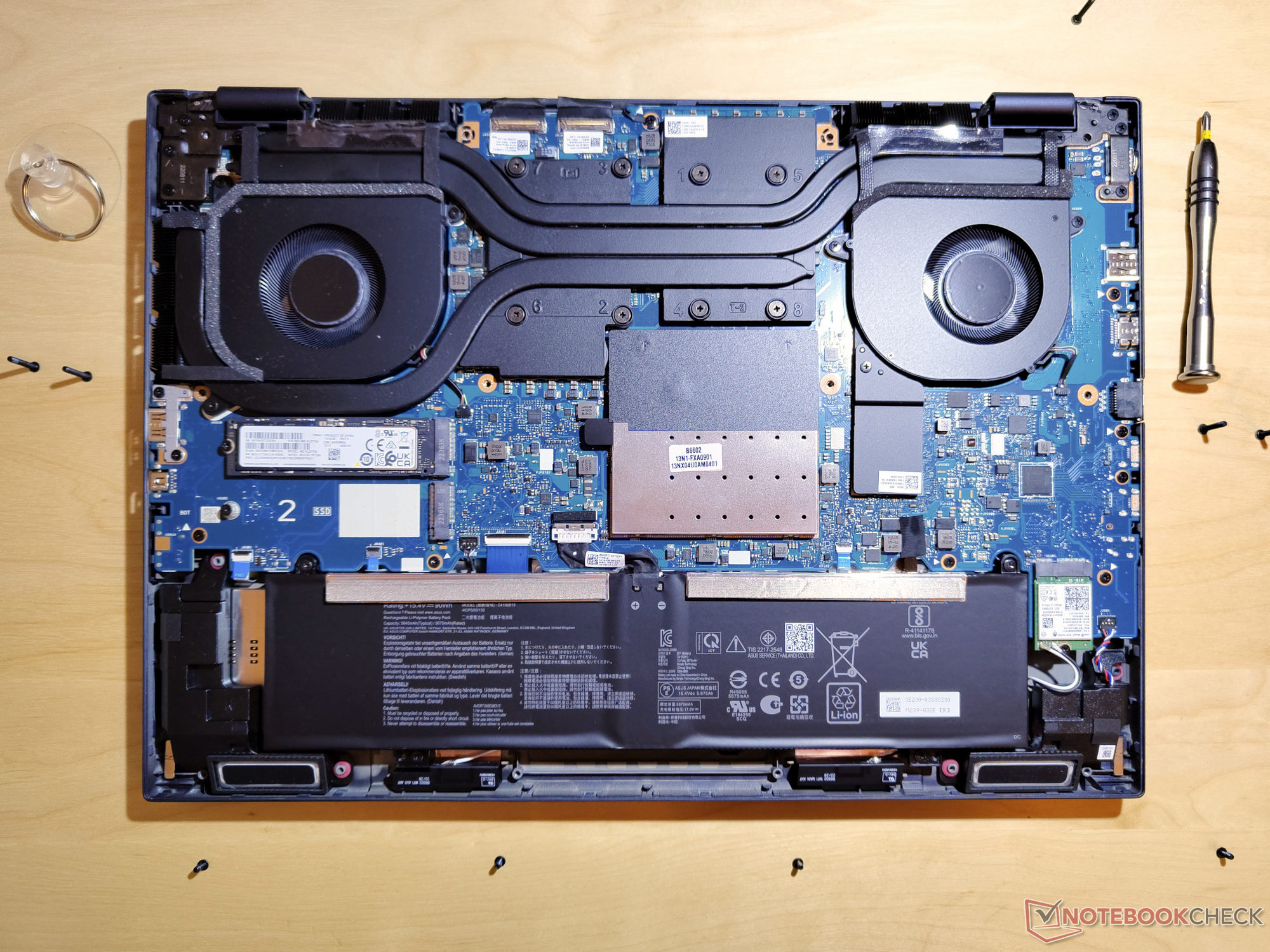 Für das ExpertBook B6 Flip stellt Asus ein englischsprachiges Servicemanual bereit. Hier wird beschrieben, wie das Convertible zu öffnen ist und wie Akku, M.2-SSD, RAM-Module, Mainboard und Bildschirm getauscht werden können. Zwei der vier RAM-Slots und die beiden M.2-Slots sind leicht erreichbar, nachdem die Bodenabdeckung entfernt wurde. Die anderen beiden RAM-Slots befinden sich auf der Oberseite der Hauptplatine. Möchte man diese erreichen, muss das komplette Mainboard ausgebaut werden. Dies wird in der Anleitung mit 16 Schritten beschrieben. Bei diesem Vorgang müssen auch der Bildschirm und das komplette Kühlsystem abmontiert werden.