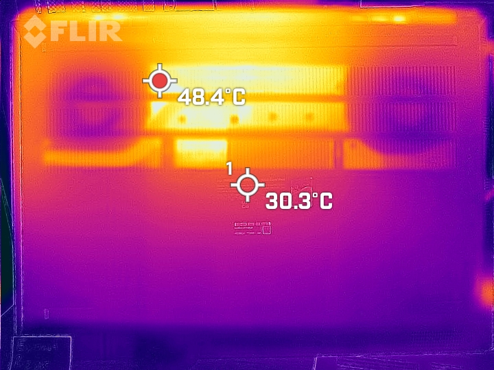 (-) Die maximale Temperatur auf der Oberseite ist 48.4 °C. Im Vergleich liegt der Klassendurchschnitt bei 38.2 °C (von 22.2 bis 69.8 °C für die Klasse Workstation).