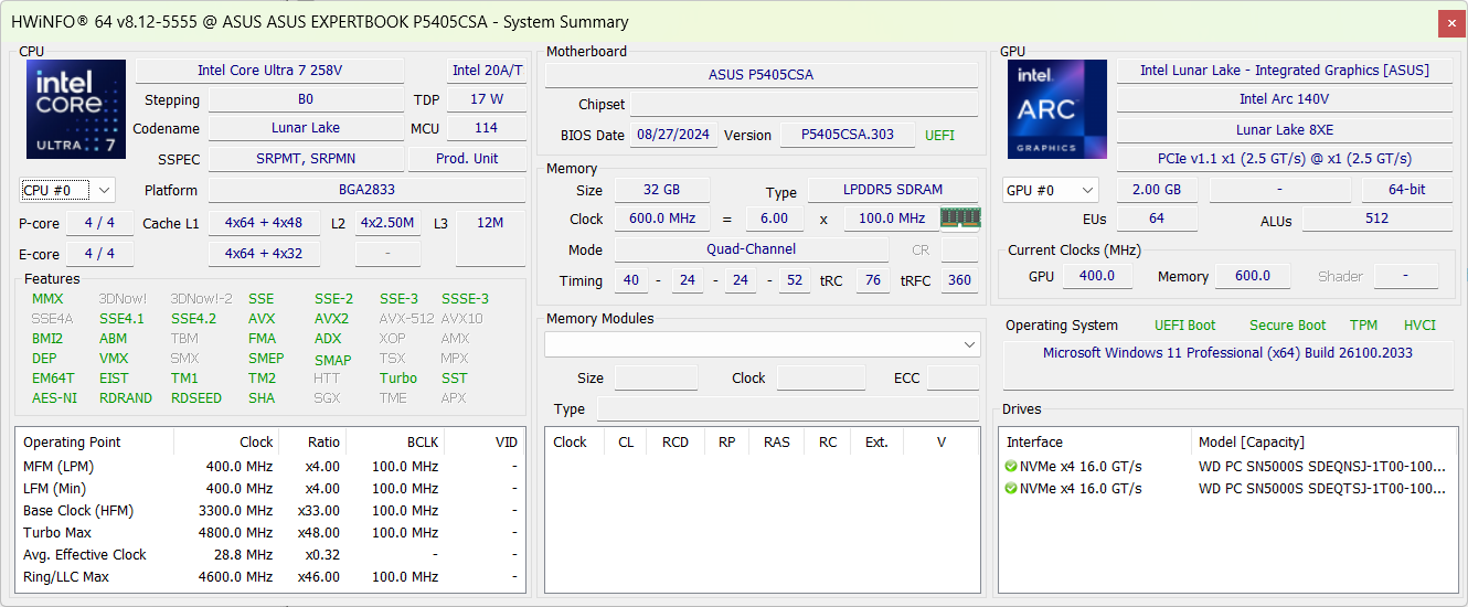 | Asus ExpertBook P5 P5405-NZ0102X Arc 140V, Core Ultra 7 258V, Western Digital PC SN5000S SDEQNSJ-1T00 | HP EliteBook Ultra G1q 14 Adreno X1-85 3.8 TFLOPS, SD X Elite X1E-78-100, SK hynix PC801 HFS512GEJ9X101N BF | Lenovo ThinkPad T14s Gen 6 21N10007GE Adreno X1-85 3.8 TFLOPS, SD X Elite X1E-78-100, Samsung PM9C1a MZAL81T0HDLB | Asus ExpertBook B9 B9403CVA-KM0153X Iris Xe G7 96EUs, i7-1355U, Samsung PM9A1 MZVL21T0HCLR | Lenovo ThinkPad T14s Gen 5 21LS001PGE Graphics 4-Core iGPU (Arrow Lake), Ultra 5 125U, WD PC SN740 SDDQNQD-512G-1014 | |