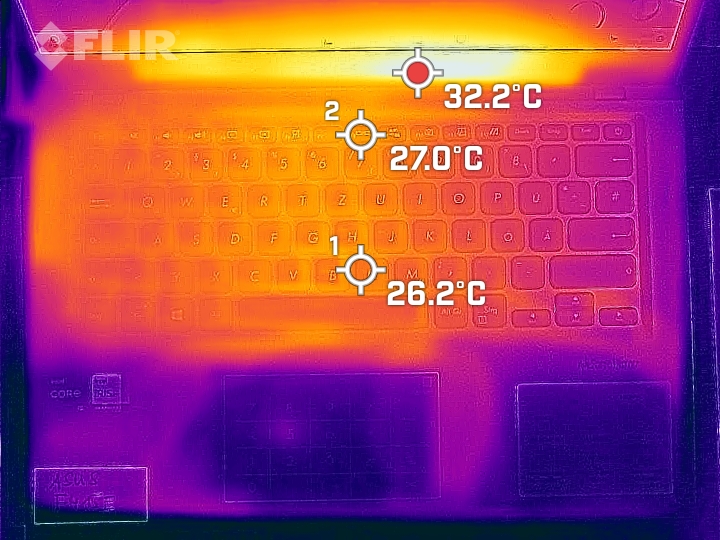 (+) Die Handballen und der Touchpad-Bereich sind mit gemessenen 29.9 °C kühler als die typische Hauttemperatur und fühlen sich dadurch kühl an.