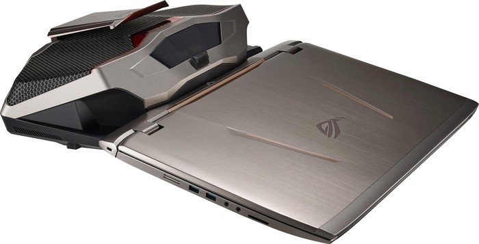 Der Laptop misst 429 x 309 x 33 ~35 mm, wobei der Thermal-Dock 417 x 368 x 114 mm misst. In puncto Gewicht bringt der Laptop selbst 3,9 kg auf die Waage. Mit Thermal Dock erhöht sich das Gewicht auf 4,6 kg. Die Entertainment-Features umfassen einen ASUS Sonic Studio Audio-Controller und eine HD-Webcam. In puncto Schnittstellen stehen eine Mikrofon/Kopfhörerbuchse, zwei USB-3.1-Type-C-Ports, ein RJ45-LAN-Port, ein HDMI-Port, ein Mini-DisplayPort, ein Thunderbolt-Port, ein SD-Kartenleser und ein Anschluss für den Stromadapter zur Verfügung.