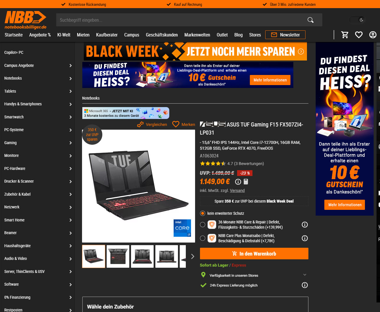 High-End-Gaming-Notebooks laufen innerhalb des Asus-Sortiments unter der Bezeichnung „ROG“ (Republic of Gamers), „TUF“ (The Ultimate Force) deckt das untere bis mittlere Preissegment ab. Dabei setzt die Firma sowohl auf AMD-APUs als auch auf Intel-Prozessoren. Aktuell führt Notebooksbilliger.de mit dem Asus TUF Gaming F15 FX507ZI4-LP031 ein Intel-basiertes 15,6-Zoll-Modell zu einem Angebotspreis von 1.149 Euro im Sortiment. Diese Variante des F15 haben wir noch nicht getestet.