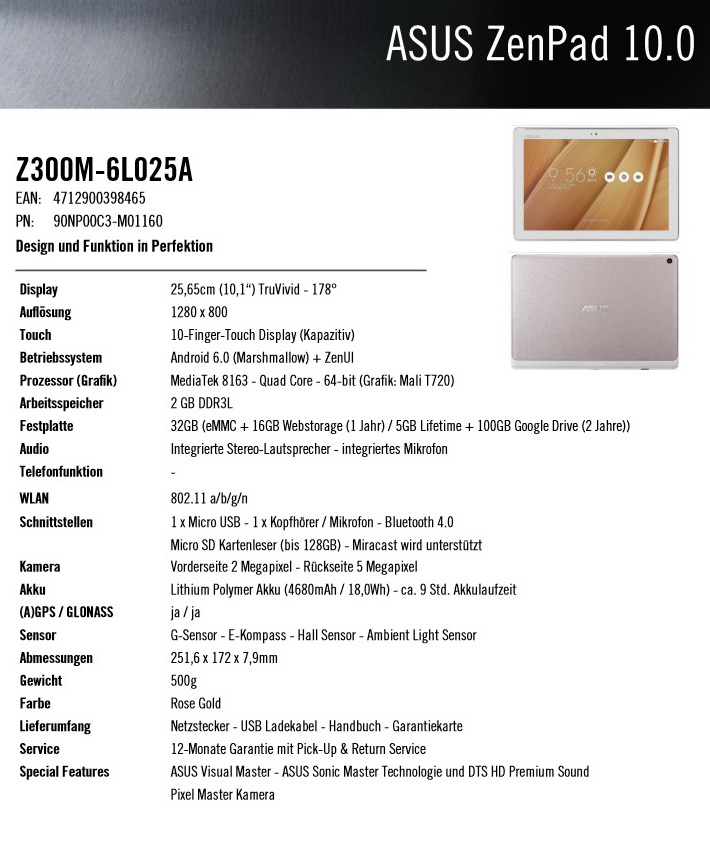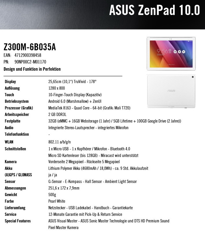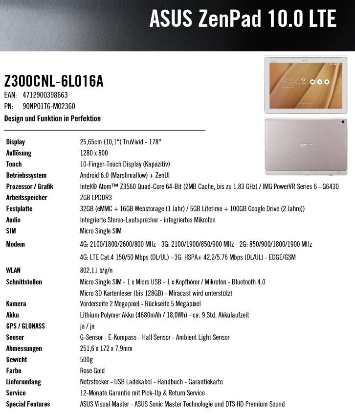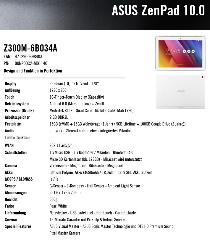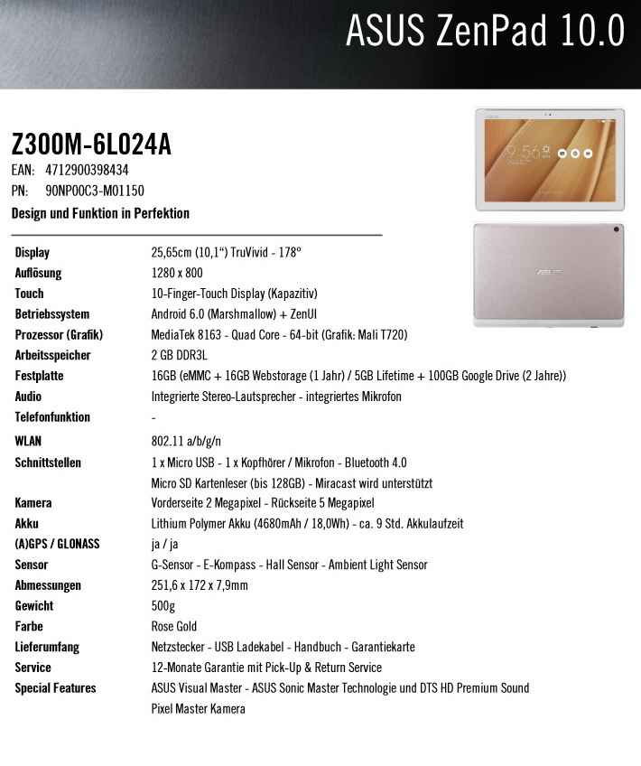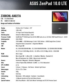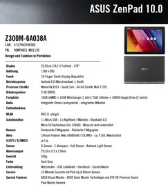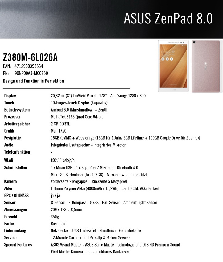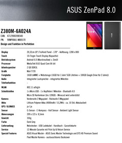 Asus hat uns inzwischen die Spec-Sheets mit den technischen Daten und Spezifikationen der Modelle ZenPad 8.0 Z380M, ZenPad 10 Z300M und ZenPad 10 Z300CNL zukommen lassen. Wir haben die Datenblätter der Asus-Tablets in die Bilderstrecke eingefügt.