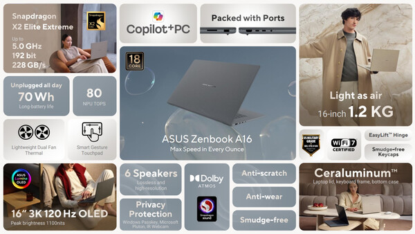 Das größere Zenbook A16 wurde für seine hohe Leistung und das leichte Gehäuse positiv aufgenommen und dient praktisch als mit dem Qualcomm Snapdragon X2 ausgestattete Alternative zur bestehenden Zenbook-S16-Serie. Viele kritisierten jedoch schnell, der taiwanesische PC-Hersteller den Preis des Asus Zenbook A16 kurz nach dem Marktstart nachträglich um 100 Dollar angehoben hat.