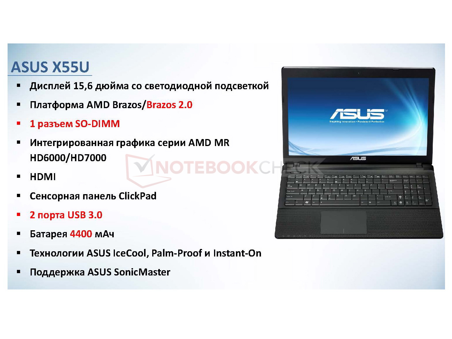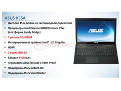 Das Pendant zum Asus X55U hört auf die Modellbezeichnung Asus X55A und arbeitet mit Kernkomponenten von Intel. Als Chipsatz soll der Intel HM70 fungieren, für die CPUs sind laut den uns vorliegenden Informationen Intels Celeron B800 oder Pentium B9xx und die integrierte Intel HD Graphic 2000 vorgesehen. Ansonsten sind die technischen Daten mit denen des X55U vergleichbar. Angaben zu Preisen und zur Verfügbarkeit finden sich im Dokument hingegen nicht.