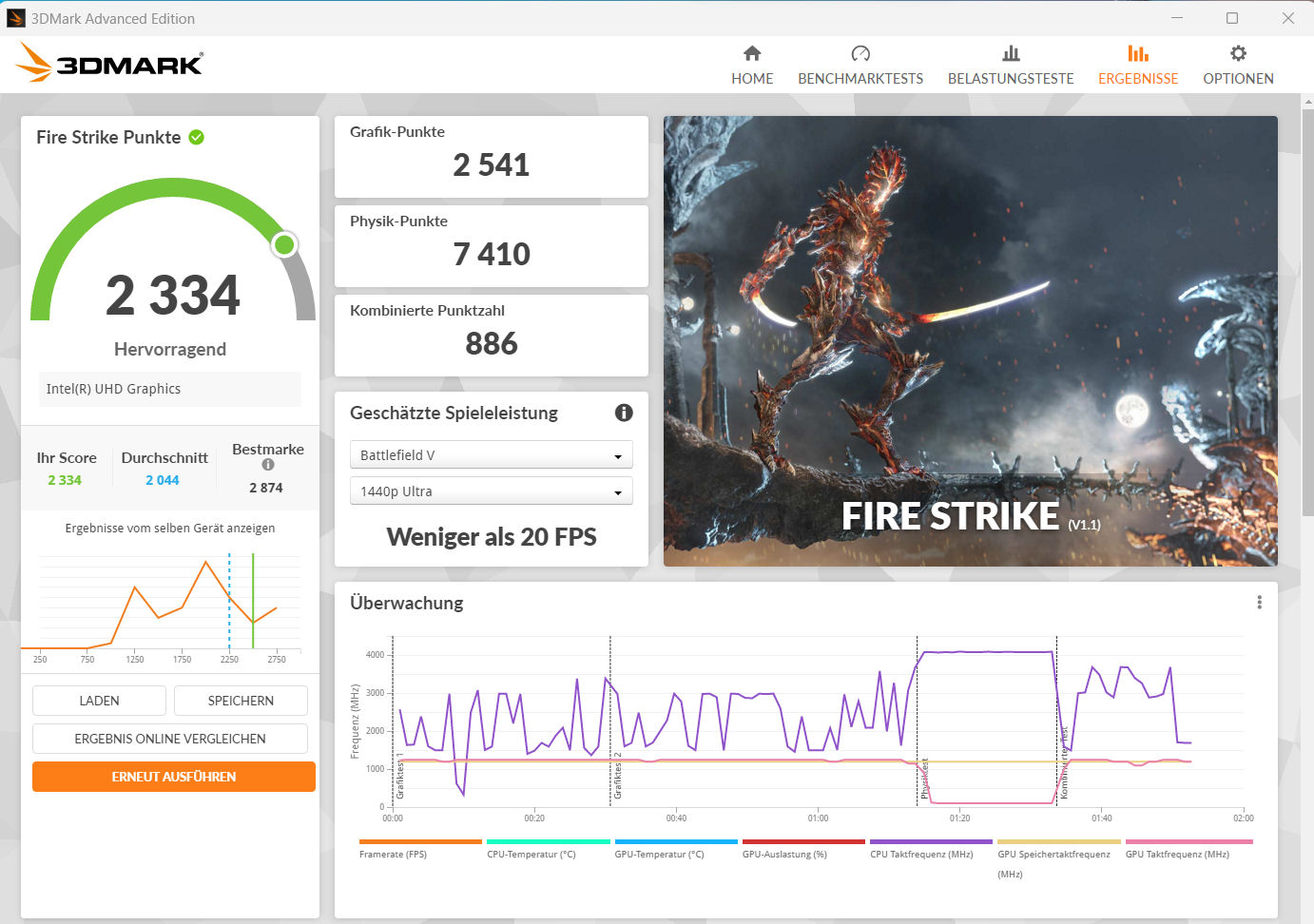 | 3DMark Fire Strike Score | 2332 Punkte | |