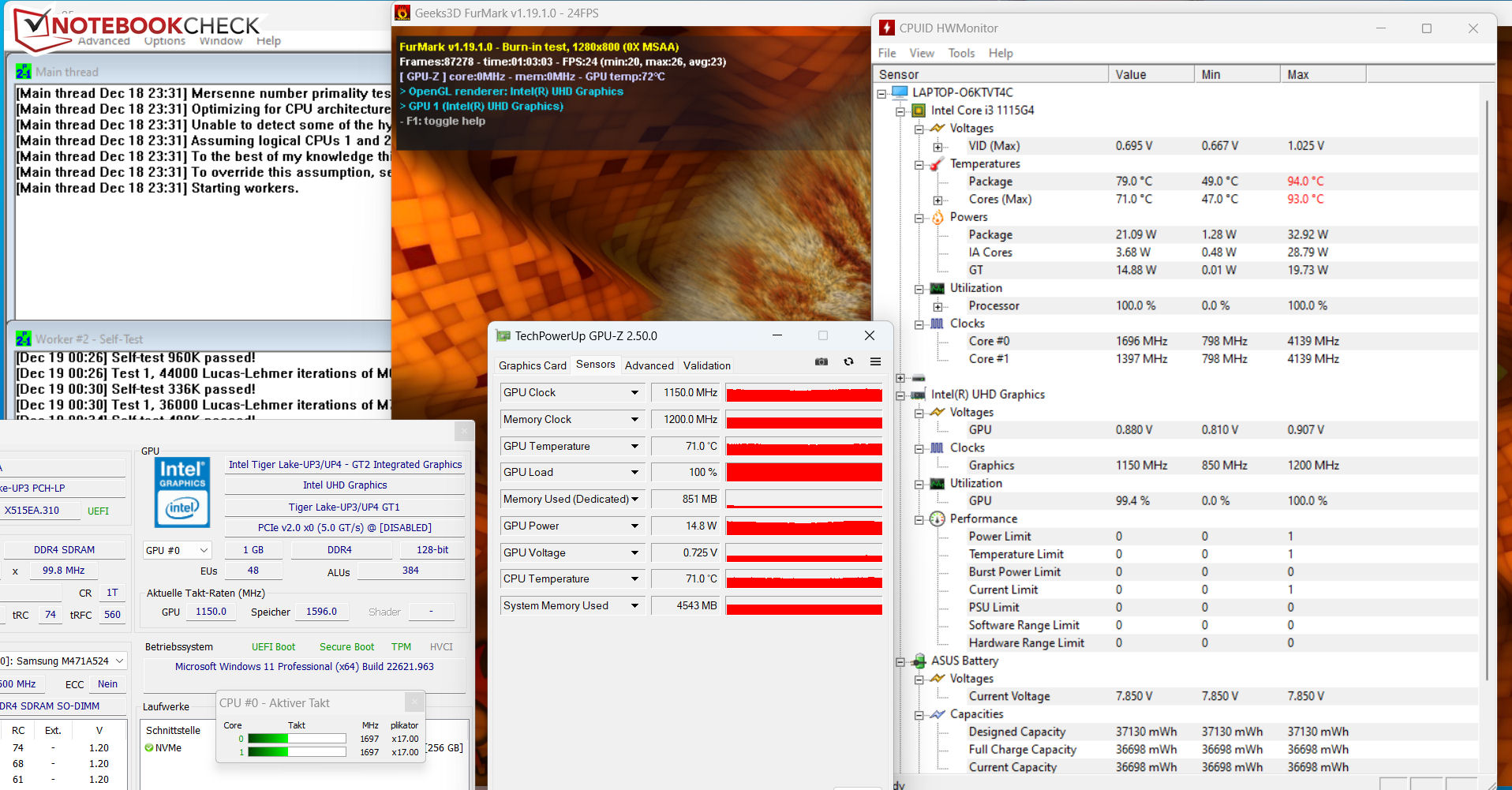 Der Stresstest (Prime95 und Furmark im Dauerbetrieb) stellt ein Extremszenario zur Überprüfung der Systemstabilität unter Volllast dar. Der CPU-Takt sinkt im Laufe des Tests von anfänglich 2,8 GHz auf 1,6 GHz. Der Takt des Grafikkerns verringert sich nur leicht von 1.200 auf 1.150 MHz.