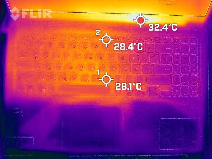 (+) Die Handballen und der Touchpad-Bereich sind mit gemessenen 27.3 °C kühler als die typische Hauttemperatur und fühlen sich dadurch kühl an.