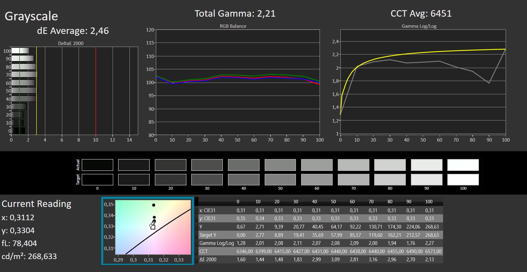 | Delta E Graustufen * | 2.46 | 4.69 -91% | 8.52 -246% | 2.79 -13% | 2.57 -4% | 13.29 -440% |