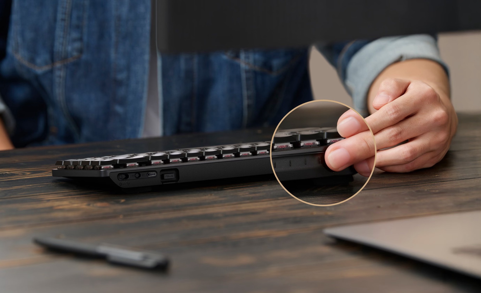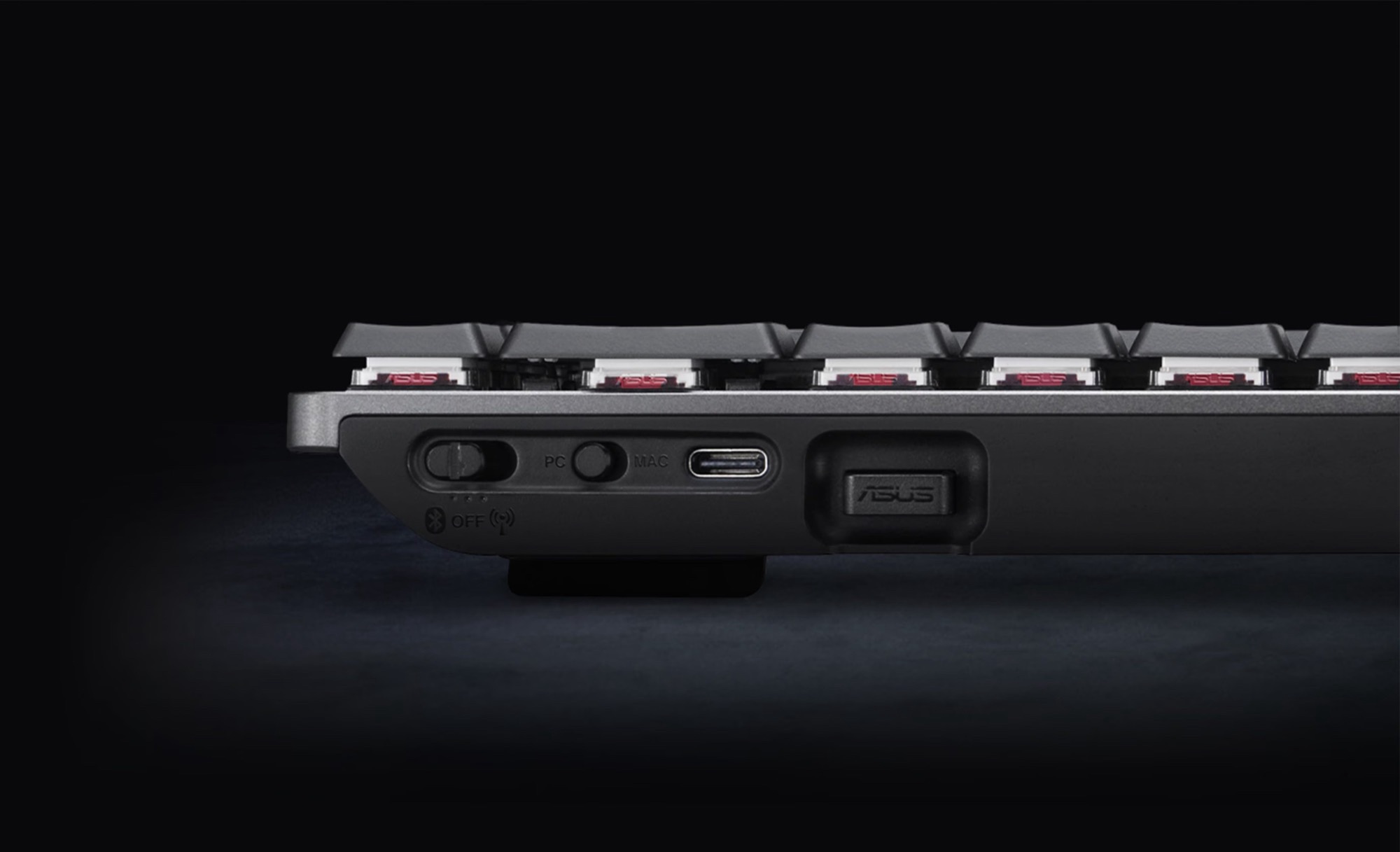 Ein Touch-Panel auf der Rückseite der Tastatur erlaubt es unter anderem, die Lautstärke des verbundenen Computers mit einer Wisch-Geste zu steuern. Asus verbaut optische RX Low Profile Schalter, deren Feeling mit linearen Schaltern vergleichbar sein soll. Ausklappbare Standfüße erlauben es, den Winkel der Tastatur in zwei Stufen anzupassen.