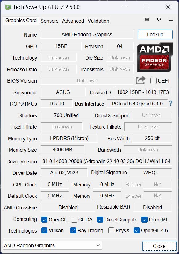AMD Radeon Graphics RDNA 3 & 4 GB RAM/2,8 TFlops 4 CUs / max. 2,5 GHz |