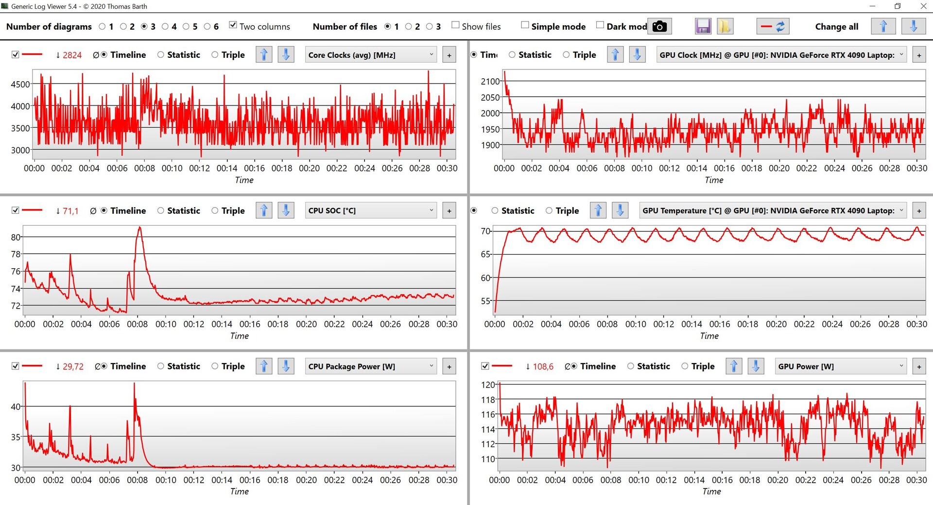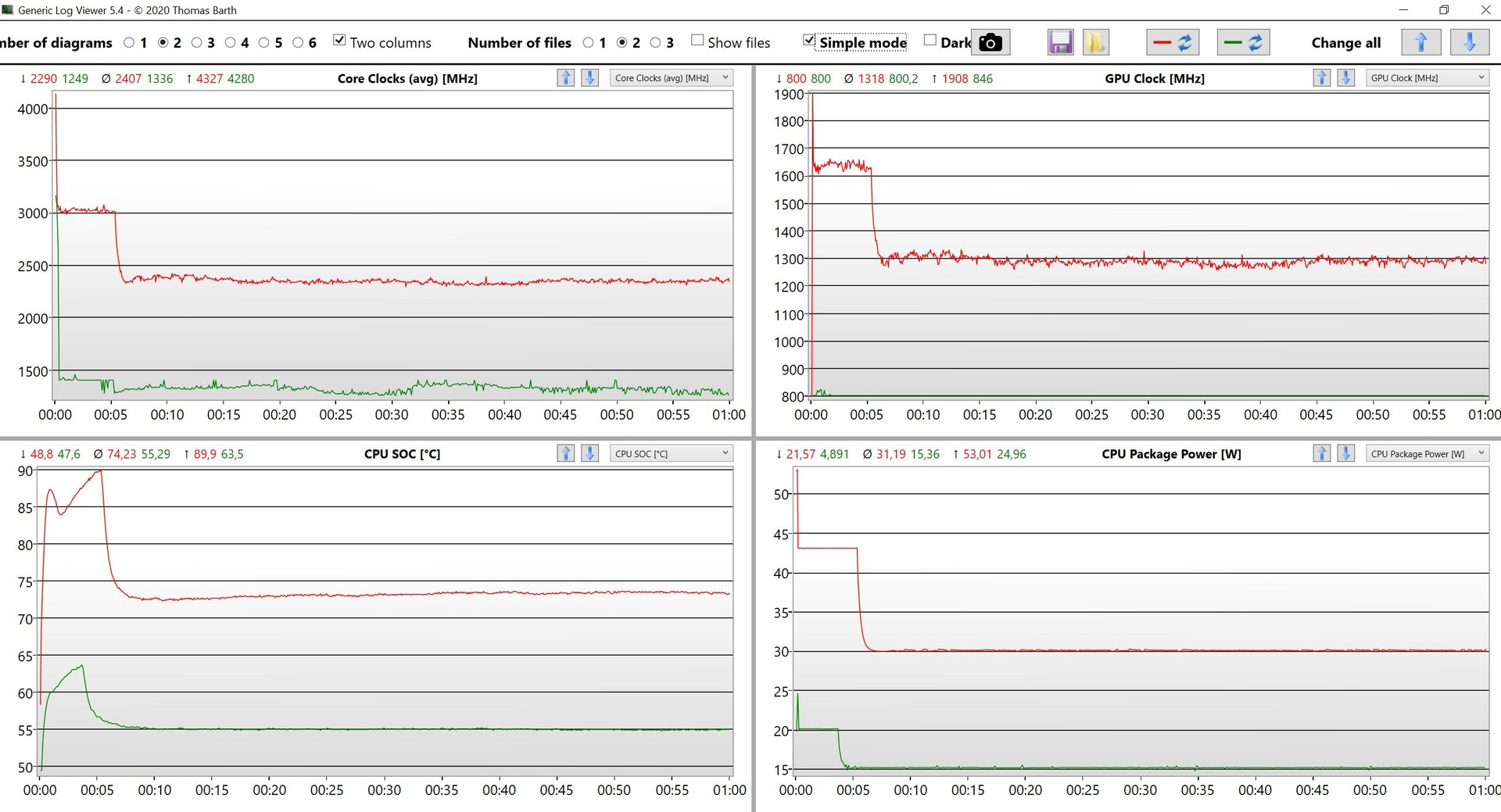 Der Stromverbrauch des ROG Ally ist im Leerlauf gar nicht mal so sparsam, denn bei minimaler Helligkeit messen wir immer noch 4,2 Watt. Hier gibt es auch einige Notebooks mit deutlich größeren Bildschirmen, die sparsamer sind. Bei der vollen Helligkeit steigt der Wert auf 6,3 Watt. Unter Last verhält sich das Gerät ebenfalls wie ein normales AMD basiertes Subnotebook und sowohl beim Spielen als auch im Stresstest pendelt sich der Verbrauch im Turbo-Modus nach wenigen Minuten bei rund 50 Watt ein. In den ersten Minuten ist das Gerät mit 67 Watt am Limit des 65-Watt-Netzteils, der Akku wird aber nicht angezapft.