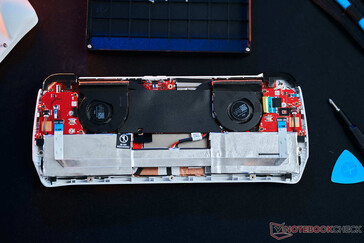 Die komplette Rückseite des ROG Ally ist nur mit einigen Kreuzschrauben gesichert und lässt sich leicht abnehmen. Im Inneren erhält man dann Zugriff auf die beiden Lüfter, den Akku sowie die kompakte M.2-2230-SSD (PCIe 4.0), die auch getauscht werden kann. Asus bietet aktuell auch direkt Ersatzteile zum Kauf an (Stand Sept. 2023, hier erhältlich). Versierte Nutzer können defekte Sticks damit beispielsweise austauschen, ohne das Gerät einschicken zu müssen.