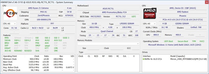 Aber auch bei der Hardware geht Asus keine wirklichen Kompromisse ein und für 799 Euro bekommt man den modernsten Prozessor, den es aktuell gibt (bzw. auf den wir bei Notebooks noch sehnlichst warten). Der AMD Ryzen Z1 Extreme ist im Endeffekt der neue Ryzen 7 7840U mit 8 schnellen Zen4-Kernen (4 nm, Phoenix) samt der neuen Radeon-780M-iGPU. Vor allem die CPU-Leistung im Turbo-Modus ist beeindruckend und der kompakte Gaming-Handheld stellt die meisten kompakten Laptops in den Schatten, wenn es um die Multi-Core-Leistung geht. Daher sind wir auch schon sehr gespannt auf die Benchmarks mit der externen GeForce RTX 4090 Laptop, die wir in den nächsten Tagen noch nachreichen werden. Wir vermuten, dass die CPU hier nur einen recht kleinen Einfluss auf die Gaming-Leistung hat, wenn man das Asus ROG Zephyrus G14 als Anhaltspunkt nimmt, wo die Ryzen-9-7940HS-CPU beim Spielen auch nur 35 Watt verbrauchen darf.