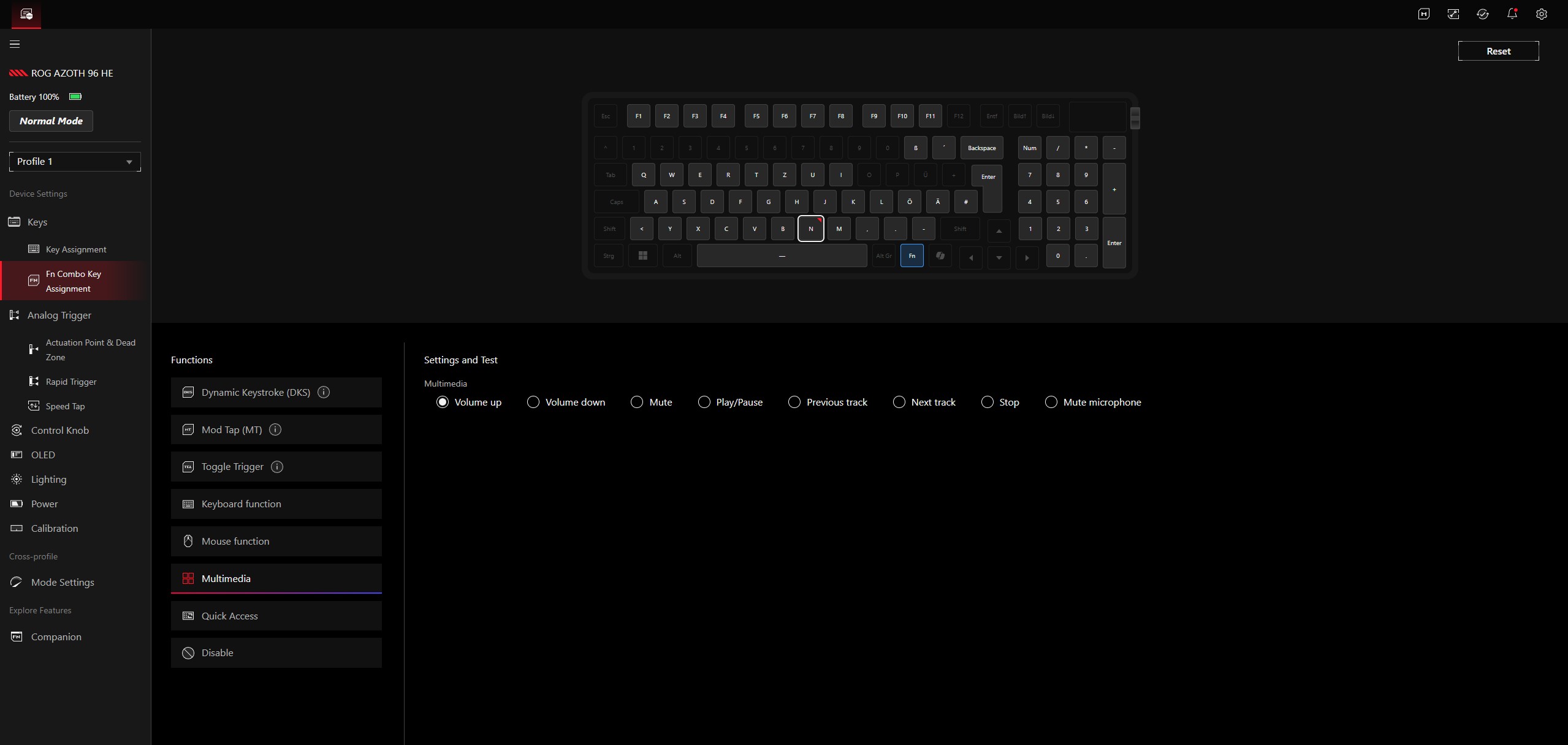 Die Verwaltung und Konfiguration der Asus ROG Azoth 96 HE erfolgt über Gear Link und damit über ein recht übersichtliches Web-Interface. Die Installation einer zusätzlichen App (Gear Link Companion) ist nicht erforderlich, erlaubt aber die Nutzung einiger zusätzlicher Funktionen. Es ergeben sich umfangreiche Möglichkeiten, so lassen sich erst einmal auch verschiedene Profile anlegen. Fast allen Tasten lassen sich andere Funktionen zuweisen, zudem werden unterschiedliche Funktionen für das Tippen und das Gedrückthalten unterstützt. Zudem können abhängig von der Eindrücktiefe ebenfalls verschiedene Funktionen ausgelöst werden. Mit den FN-Tasten lassen sich unter anderem Multimediafunktionen zuweisen. Gear Link unterstützt für jede einzelne Taste die Definition eines individuellen Auslösewegs.