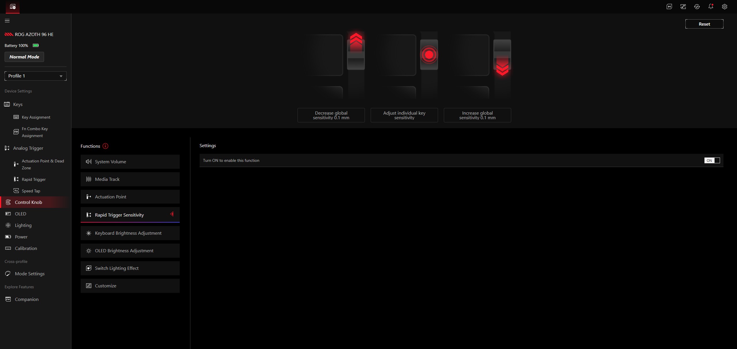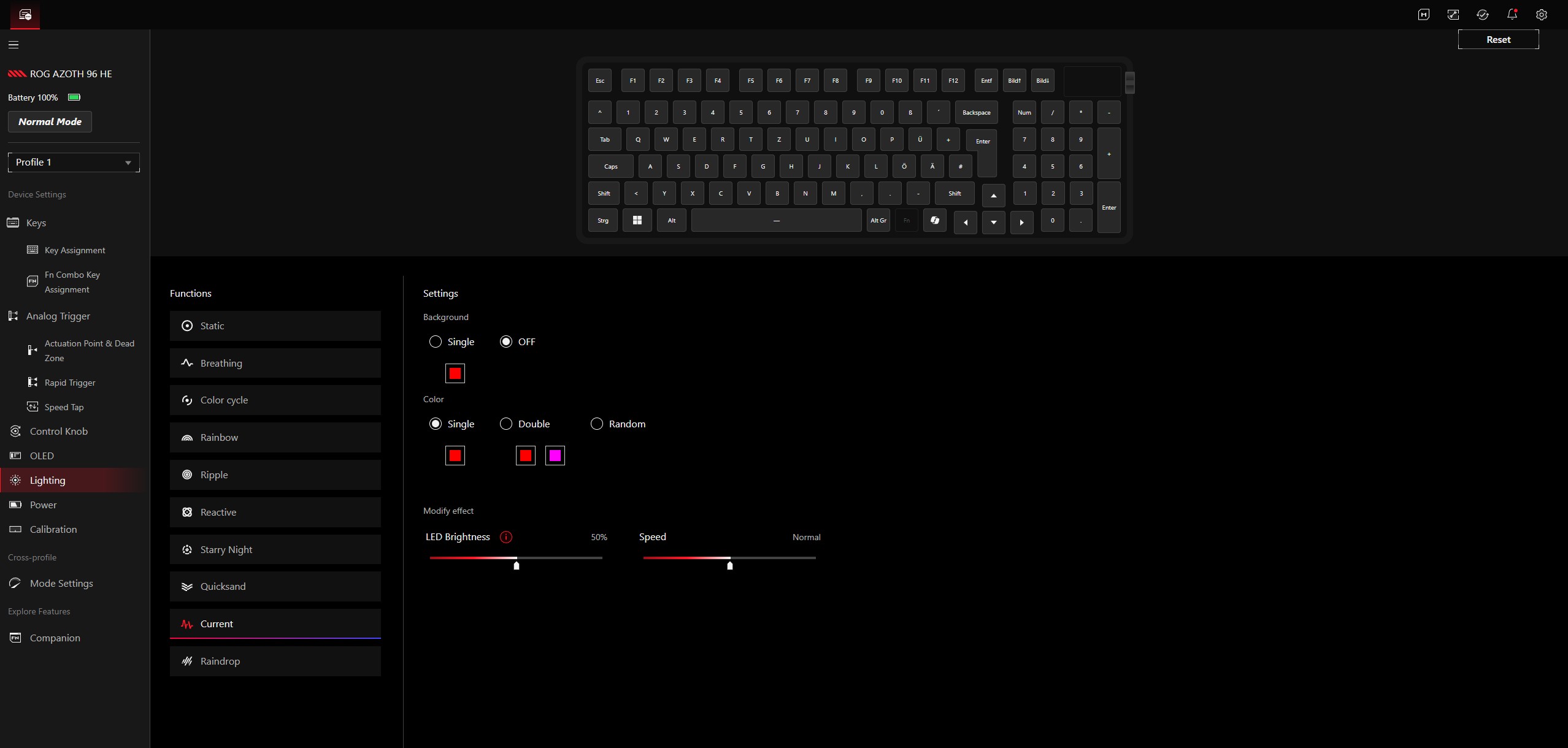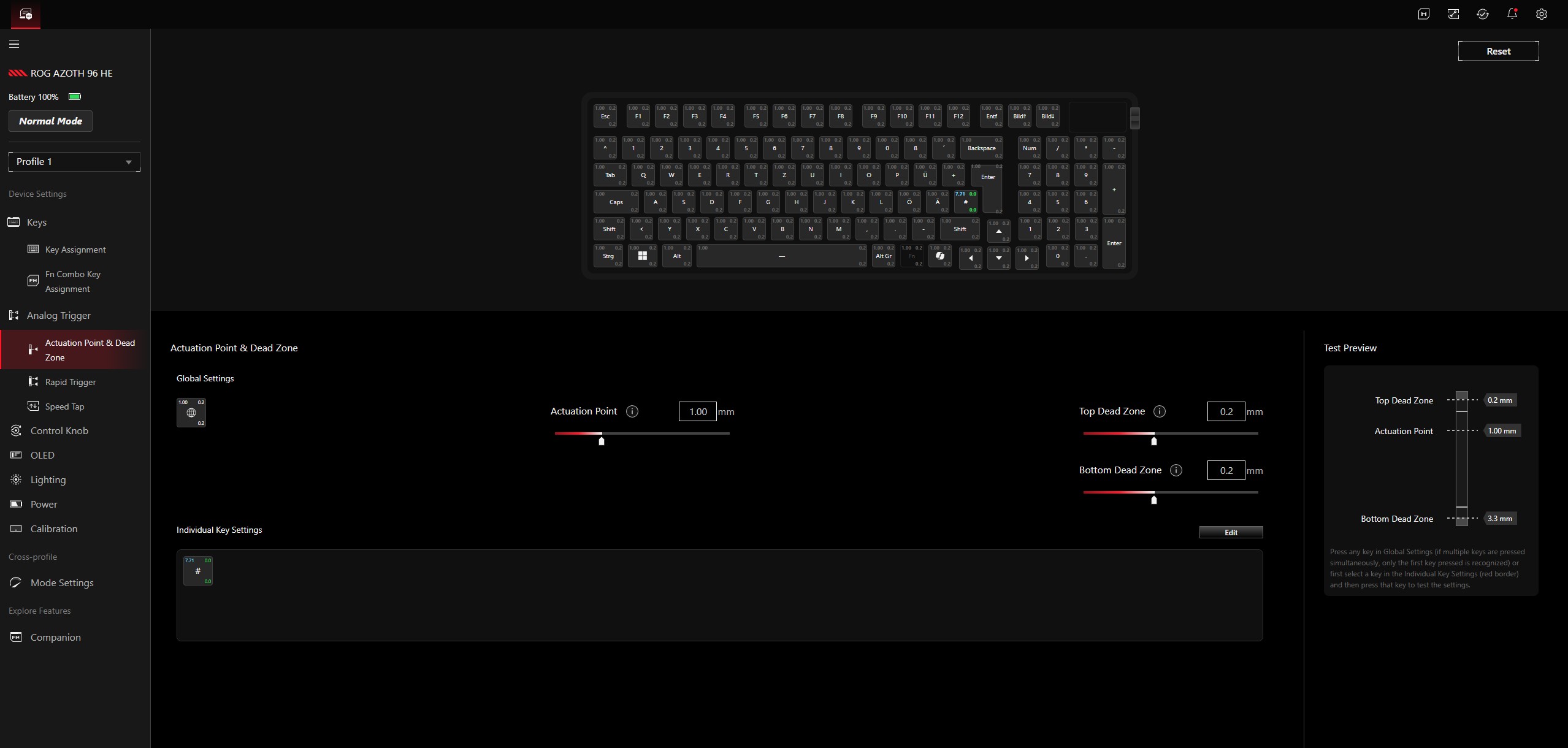 Bei der Nutzung sowohl im Alltag und bei produktiven Anwendungen als auch beim Gaming schlägt sich die ROG Azoth 96 HE hervorragend. Wir empfehlen explizit, sich für die Einstellung der optimalen Aktivierungstiefe einmal ein wenig Zeit zu nehmen - dass diese einstellbar ist, stellt eben im Vergleich zu einer klassischen Tastatur einen enormen Vorteil dar und ermöglicht es in der Praxis, den besten Punkt zwischen schneller Auslösung und Verhinderung von Fehleingaben zu finden. Der Betätigungsbereich kann in Schritten von 0,01 Millimetern und in einem Bereich von 0,1 bis 3,5 Millimetern justiert werden.