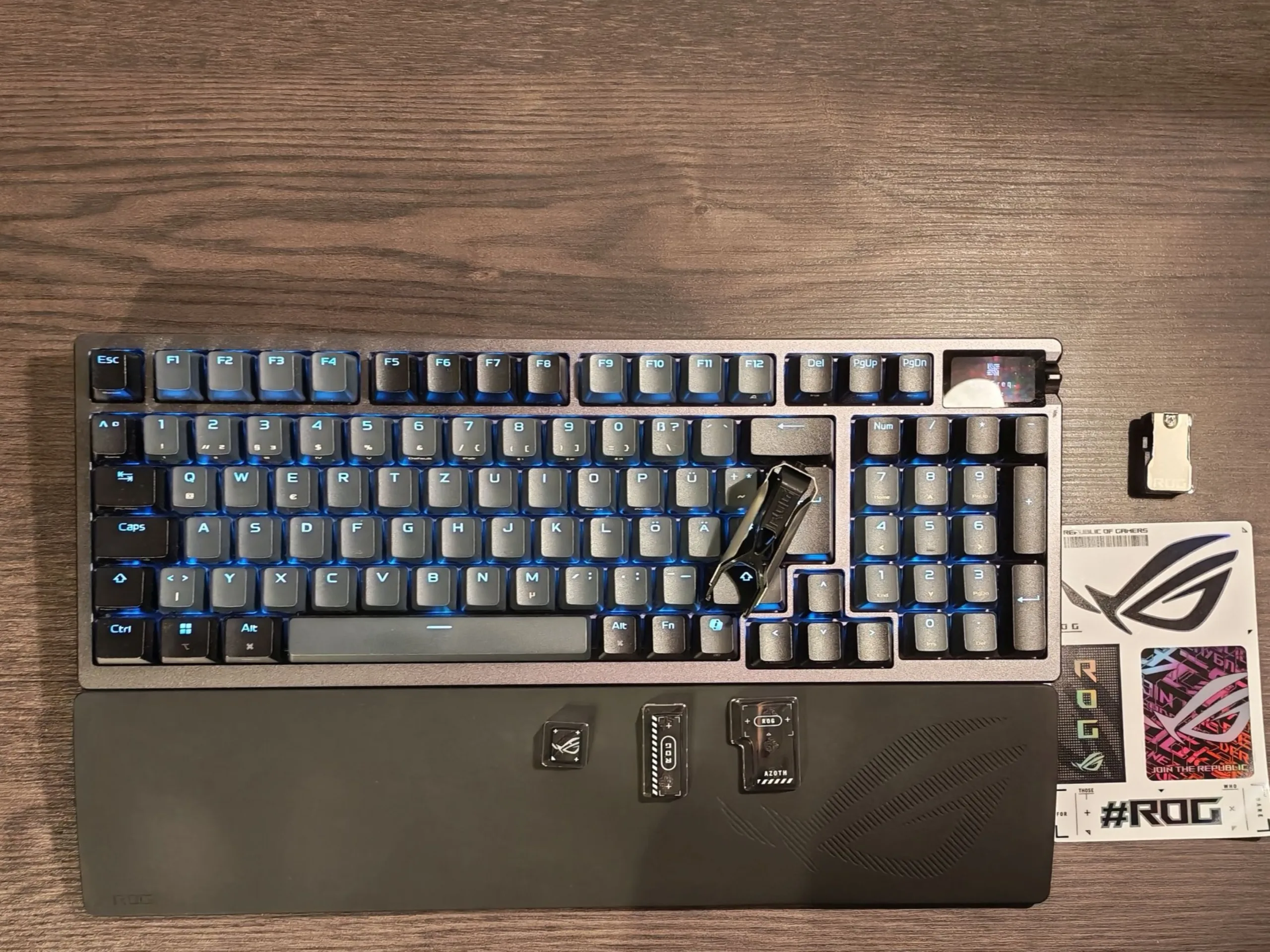 Die Asus ROG Azoth 96 HE kommt neben der eigentlichen Tastatur mit einer Handballenauflage, einem USB Typ C-Kabel, einem USB-Adapter, einer Verlängerung für den USB-Empfänger, einer Steuerungs-Tastenkappe zur Ersetzung der Copilot-Kappe und drei transparenten, zusätzlichen Tastenkappen im ROG-Layout. Zusätzlich gibt es noch Werkzeuge für die Entnahme der Kappen und der Switches - diese beiden Werkzeuge lassen sich ineinander klemmen. Die Inbetriebnahme ist denkbar einfach und kann über USB, Bluetooth oder mit dem ebenfalls mitgelieferten Wireless-Empfänger erfolgen, der beim Nichtgebrauch in der Tastatur seinen Platz findet. Die Installation einer Software ist nicht erforderlich, selbst wenn umfangreiche Konfigurationen vorgenommen werden sollen - doch dazu später mehr.