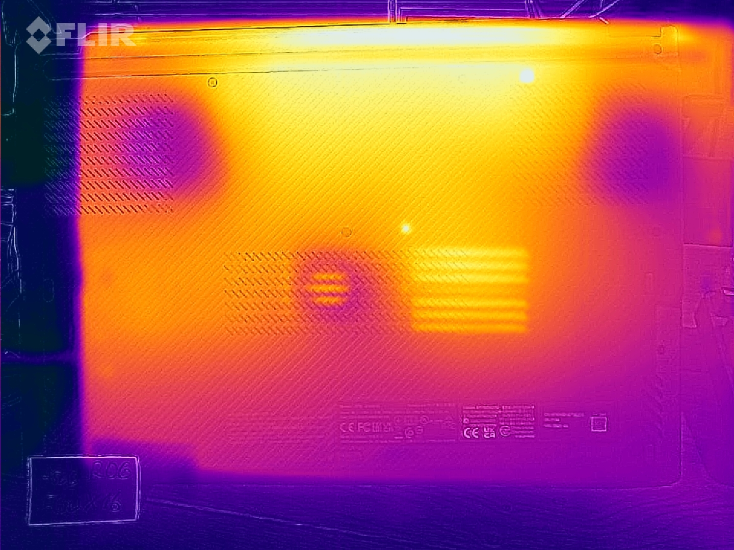 (-) Auf der Unterseite messen wir eine maximalen Wert von 50.3 °C (im Vergleich zum Durchschnitt von 43.3 °C).