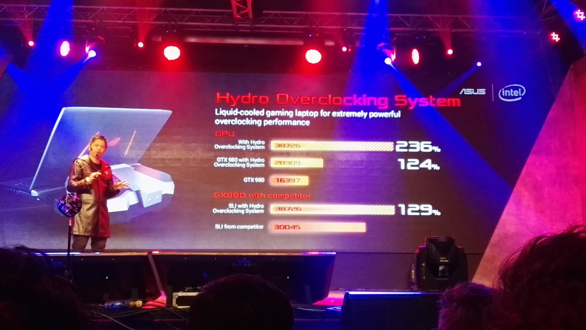 Der Nachfolger des GX700 Gaming-Laptops bietet zwei 330 Watt starke Netzteile, die einen SLI-Verbund aus zwei Nvidia-GPUs in Kombination mit einer Intel K-Serie-CPU befeuern um dadurch die Performance eines Desktop-Rechners zu erzielen. Details zu den integrierten Prozessoren und Grafikeinheiten wurden bislang nicht verraten. Wie beim Vorgänger mit dabei: die hinten andockbare Docking-Station ermöglicht mittels "Hydro Overclocking System" die Flüssigkühlung von Grafik, Speicher und Prozessor für extreme Overclocking-Experimente.