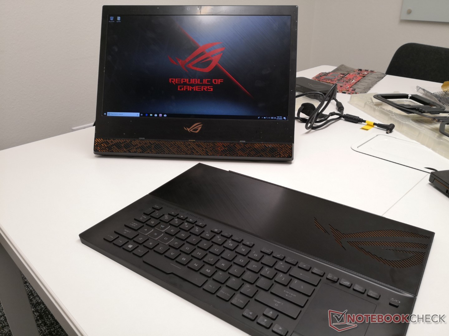 Ein weiterer wichtiger Unterschied zu einem klassischen Gaming-Laptop liegt in der Positionierung des Mainboards und der übrigen Komponenten: Diese befinden sich nicht im Basisteil, sondern im Display. Da sehr leistungsstarke Komponenten verbaut sind, könnte sich das Display potentiell stark aufheizen. Auf eine Touchscreen-Option verzichtet Asus übrigens, wodurch die Nutzung als klassisches Tablet ausscheidet.