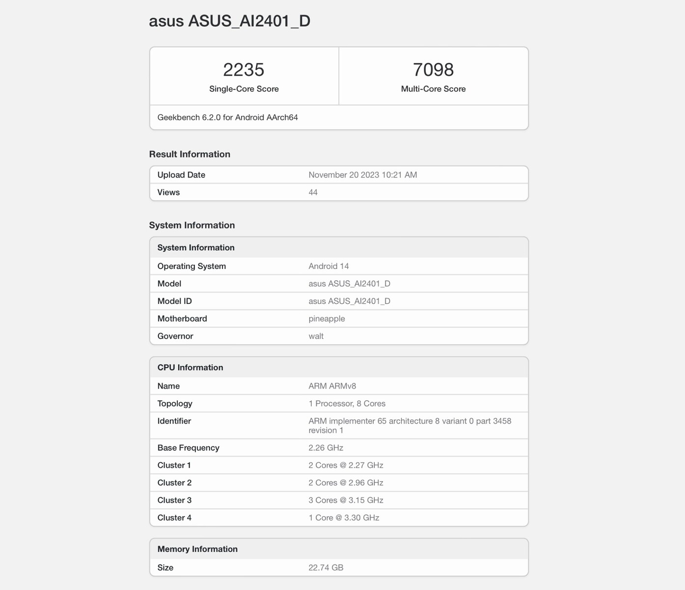 Das Asus ROG Phone 7 (ca. 1.049 Euro auf Amazon) erhält offenbar bald einen Nachfolger. Denn ein Smartphone mit der Modellnummer "ASUS_AI2401_D" wurde kürzlich bei Geekbench getestet. Dabei dürfte es sich um ein Modell der ROG Phone 8-Serie handeln, wobei nicht ganz klar ist, ob ein Prototyp des ROG Phone 8, das ROG Phone 8 Pro oder das ROG Phone 8 Ultimate getestet wurde.