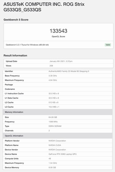 Wie üblich hängt die tatsächliche Performance von der verbauten Kühlung und der verfügbaren TGP ab. Im vermeintlich identischen Gehäuse erreicht die RTX 3080 im Geekbench OpenCL Benchmark beachtliche 133.543 Punkte, die RTX 3070 kommt immerhin auf 112.448 Punkte. Sieht man sich die Bestenliste an, so liegt die vermeintliche Max-P-Variante der GeForce RTX 3080 praktisch auf Augenhöhe mit der GeForce RTX 2080 Ti, während die RTX 3070 auf dem Performance-Level der Desktop-Variante der GeForce RTX 2080 Super liegt.