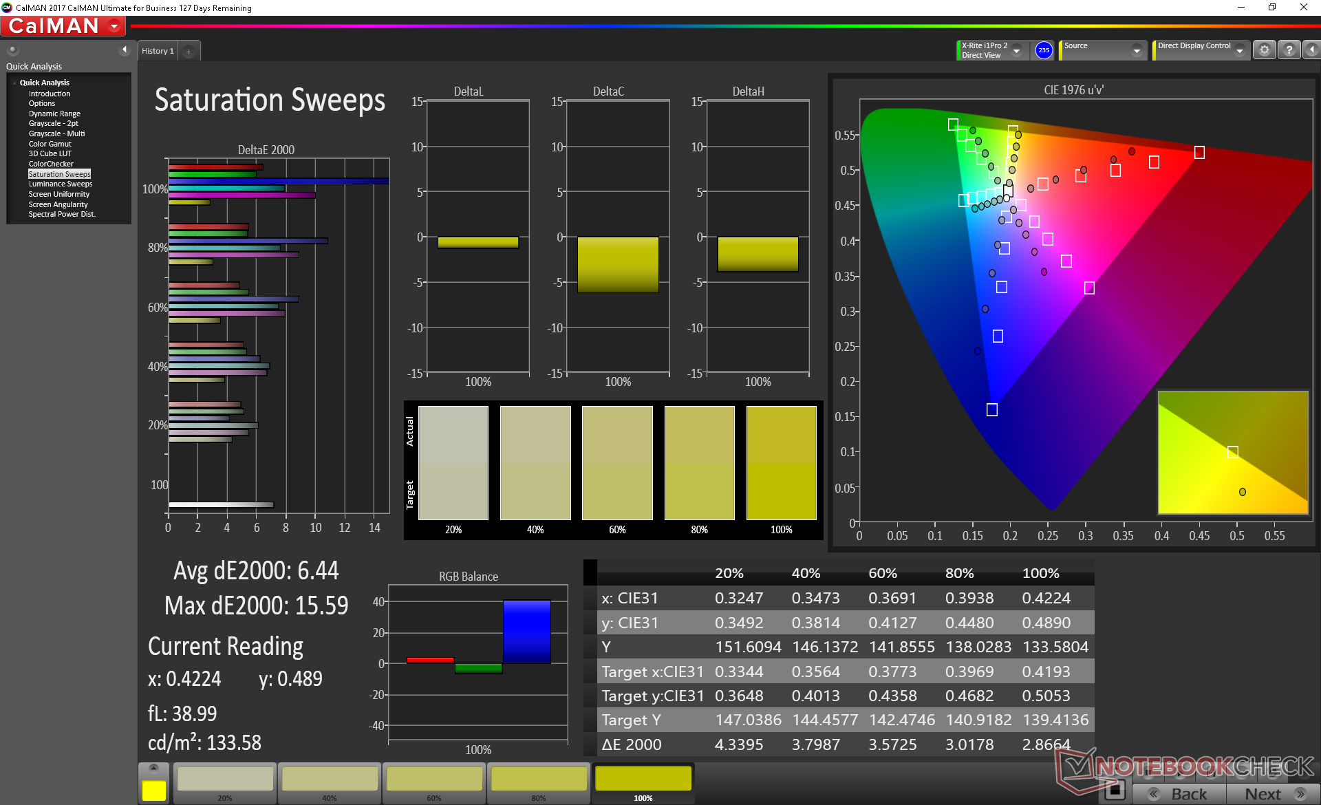 Die Farben und Graustufen sind im Lieferzustand nicht besonders genau. Der durchschnittliche DeltaE-Wert liegt für Farben bei 6,44 und für Graustufen bei 4,4. Die Farbtemperatur ist auch eher kühl, was zu einem für billige Panele typischen Blaustich führt. Während unsere Kalibrierung viele dieser Werte verbessert, bleibt die Farbgenauigkeit aufgrund des schmalen Farbraums relativ schlecht. Vor allem Blau, Magenta und Cyan werden weniger genau dargestellt als andere Farben - insbesondere bei hoher Sättigung.