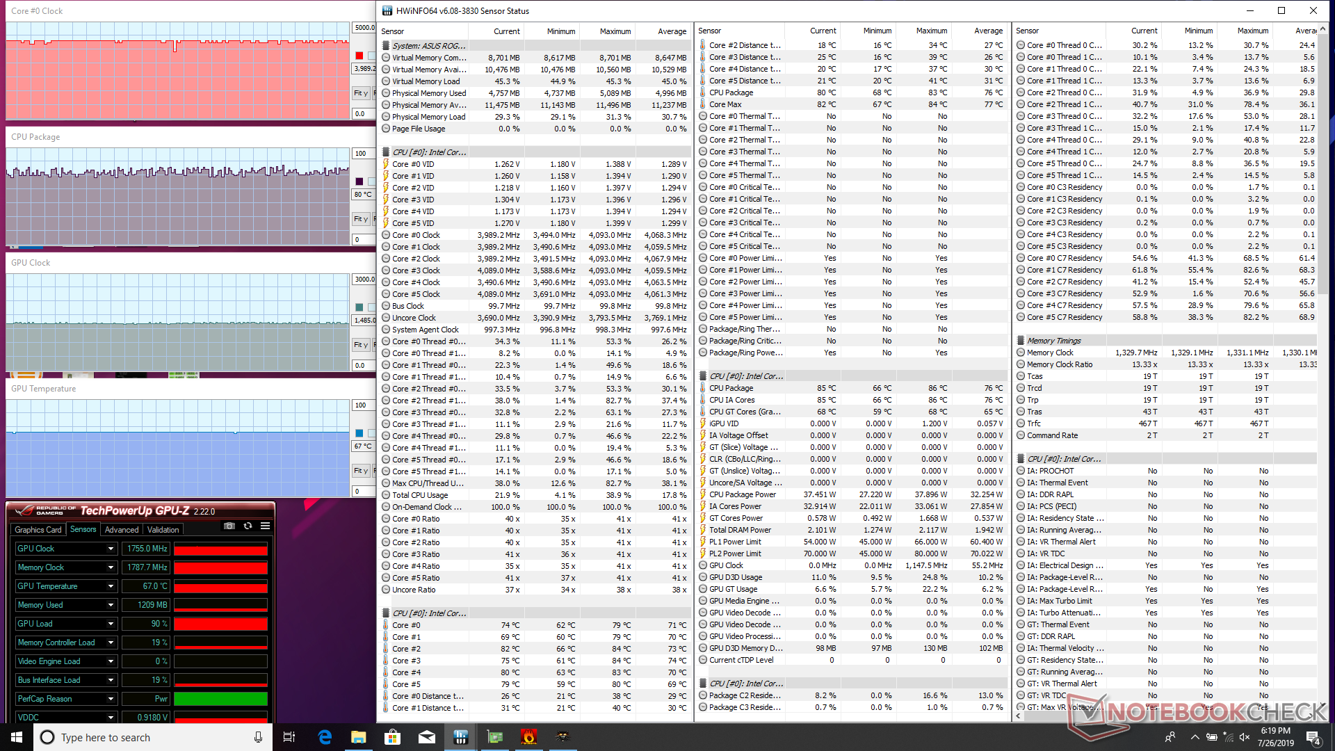 Die CPU- und GPU-Temperaturen stabilisieren sich unter Witcher 3 bei 80 °C bzw. 67 °C. Im Vergleich pendeln sich die Kerntemperaturen im Asus G531GW mit Core i9 und RTX 2070 bei 81 bzw. 77 °C ein. Das ältere mit einer GTX 1060 ausgestattete Asus GL504GM stabilisiert sich unter den gleichen Umständen bei etwa 67 °C. Der Temperaturbereich zwischen 60 und 70 °C ist für einen Gaming-Laptop immer noch recht kühl, während besonders dünne Geräte oft auch den recht heißten 80-°C-Bereich erreichen.