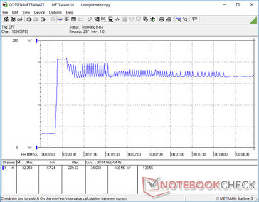 Wir konnten eine maximale Energieaufnahme von 210 W messen. Das mittelgroße Netzgerät (~16,5 x 7,5 x 3,2 cm) hat eine Nennleistung von 230 W. Die Energieaufnahme fällt nach der Spitze aufgrund von Throttling auf 167 W ab. Dies entspricht den Ergebnissen der CineBench Schleife.