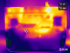 Das SoC erhitzte sich unter Dauerbelastung auf bis zu 96 °C, wenngleich ein durchschnittlicher Takt von 4,1 GHz stabil gehalten werden konnte. Bei der dedizierten GPU fällt die maximale Temperatur mit 82 °C etwas geringer aus. Das Kühlsystem wirkt beim Anblick recht massiv. Die Abwärme wird mit Hilfe zweier Axiallüfter auf der Rückseite und an den Seiten aus dem Gehäuse geblasen. Außerdem verwendet Asus laut unseren Informationen Flüssigmetall auf CPU und GPU, um eine schnellstmögliche Wärmeableitung zu gewährleisten.