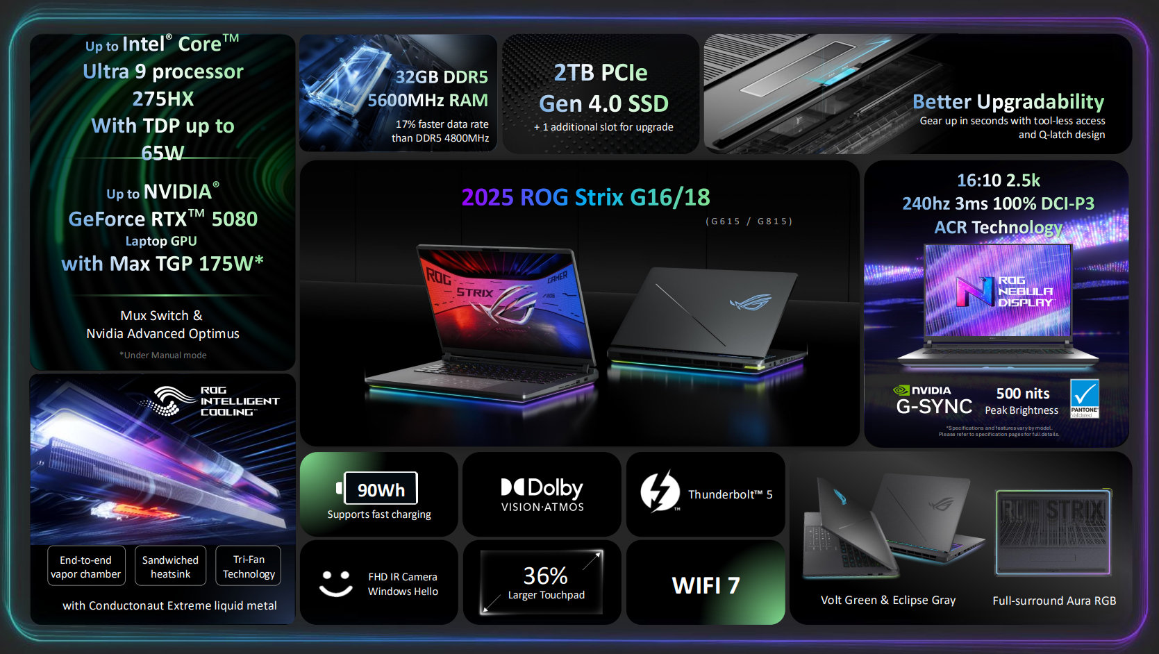 Das sieht bei den Intel-Prozessoren etwas anders aus, auch wenn der Plural hier Fehl am Platz ist. Nur der Core Ultra 9 275HX kann gewählt werden, dafür reicht die Auswahl an Nvidia-Grafikkarte aktuell von der RTX 5070 bis zur RTX 5080 mit einer TGP bis 175 Watt, also eine Stufe höher als beim Asus ROG Strix G12 und G18 mit AMD-CPU.