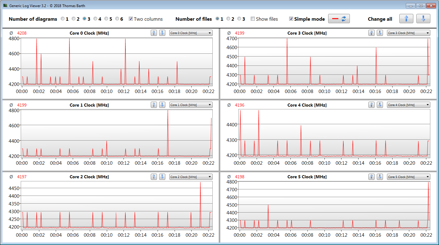 Den Multi-Thread-Test des Cinebench-R15-Benchmarks bearbeitet der Prozessor mit 4,2 GHz. Der Single-Thread-Test wird mit 4,3 bis 4,6 GHz durchlaufen. Im Akkubetrieb liegen die Taktraten bei 2,6 bis 2,8 GHz (Multi-Thread) bzw. 3,2 bis 3,5 GHz (Single-Thread).